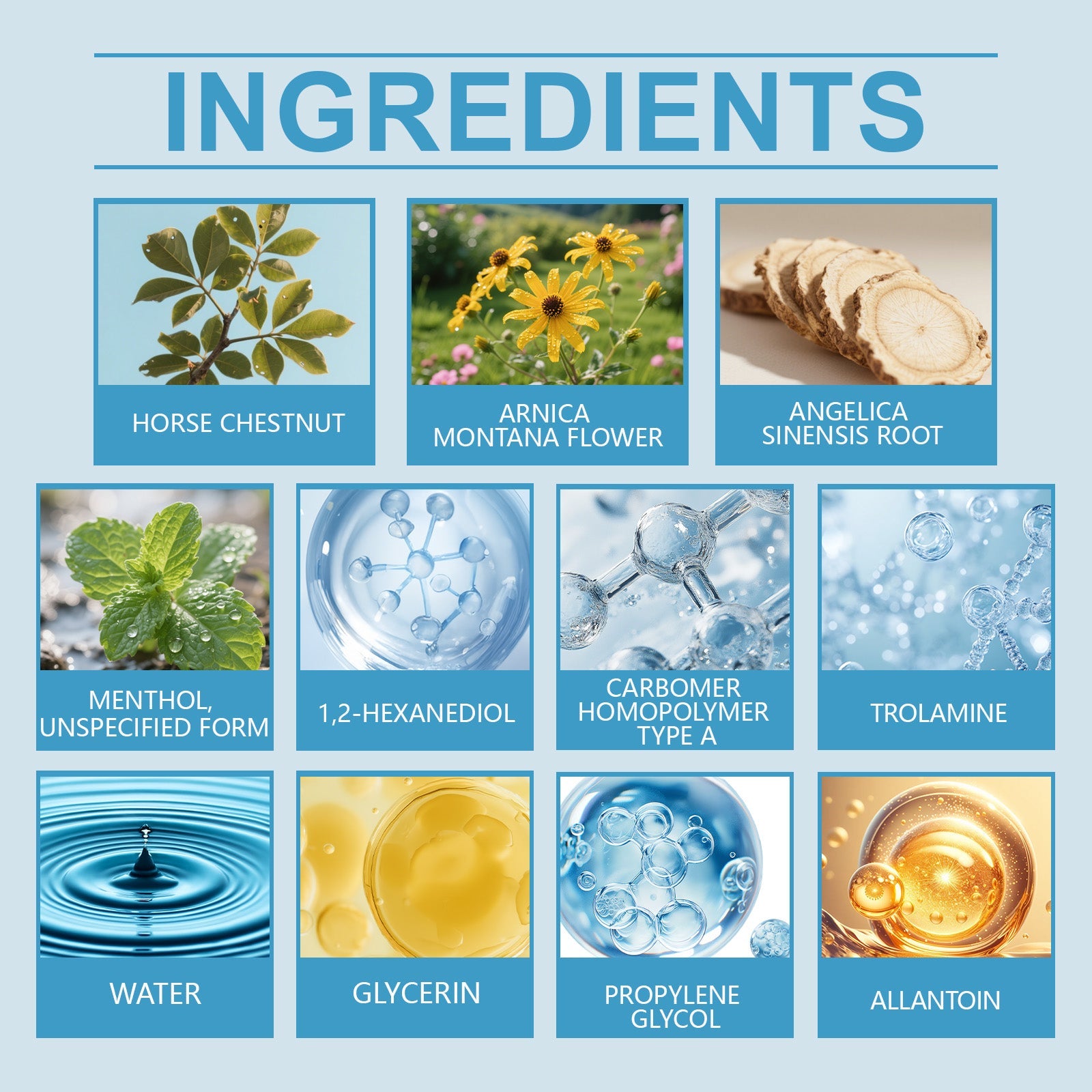 ❄️ Cooling Relief with Powerful Ingredients — Infused with Menthol and Horse Chestnut Extract to reduce inflammation and deliver a refreshing cooling sensation. Lightweight gel absorbs fast and never feels greasy.