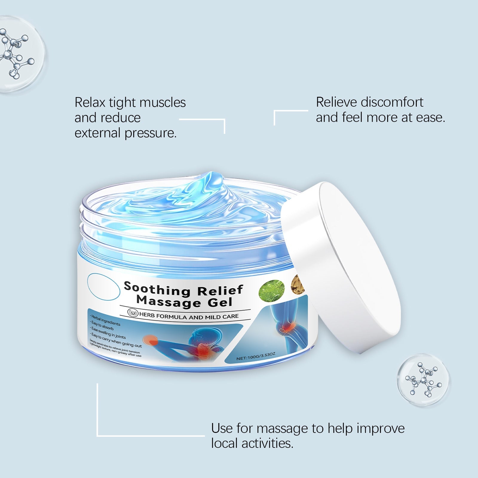 Our Body Care Gel is meticulously formulated with Menthol and Horse Chestnut Seed Extract. It is specifically designed to reduce and alleviate joint inflammation and pain, improve blood circulation, and accelerate the recovery of joint cartilage. Application is extremely simple: cleanse and dry the skin, apply an appropriate amount to the affected joint area, and gently massage to promote absorption. Additionally, it helps relax tense muscles around inflamed joints and enhances joint mobility.